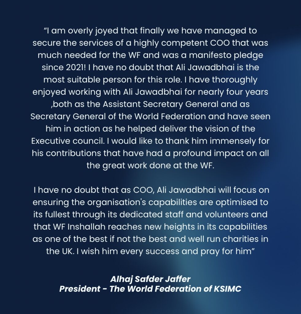 The President of The World Federation, Alhaj Safder Jaffer, in accordance with clause 19.1.2 (b) of the Constitution is pleased to announce the appointment of Alhaj Zuhairbhai Hirji as the new Secretary General of The World Federation with effect from Fri 24th April 2026.