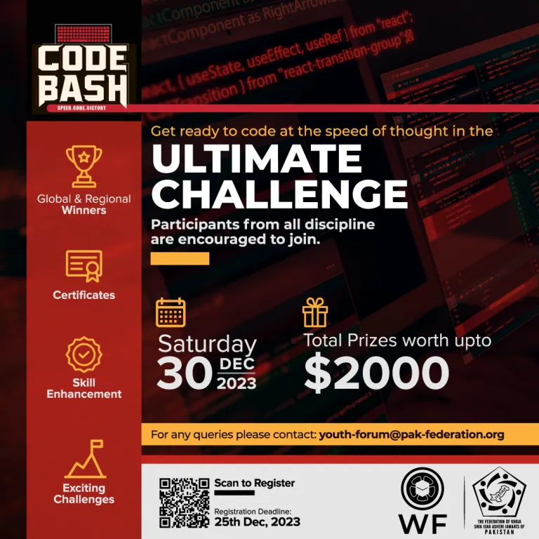 Led by Pakistan Federation, in collaboration with The World Federation of KSIMC, we are excited to announce Code Bash – Ultimate Challenge! Code Bash features the exhilarating Speed Programming event, where participants, from beginners to seasoned coders, can showcase their skills and creativity. This event will be a unique opportunity to learn, compete, and have fun with the global programming community.