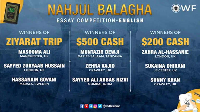 We are pleased to share the Essay eBooks on the International Essay Competition based on Nahjul Balagha, which was launched on the auspicious occasion of Eid al-Ghadeer in 2022. This prestigious competition, which was conducted in English, Urdu, and French, attracted a global participation, reflecting the widespread interest and dedication towards Nahjul Balagha – A compilation of the sermons, letters and maxims of Mawla Ameer al-Mu’mineen Ali (a) and the second most important Islamic book after the Holy Qur’an for the Shi’as.