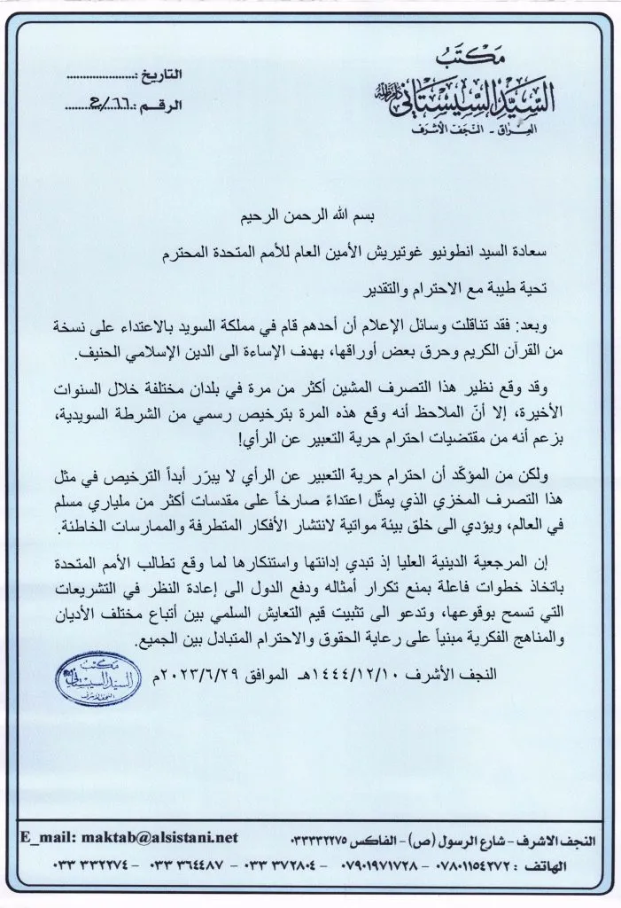 The Supreme Religious Authority condemns what happened and calls on the United Nations to take effective steps to prevent the recurrence of similar incidents, compel countries to reconsider legislation that allows such occurrences, and call for establishing the values of peaceful coexistence between followers of different religions and intellectual backgrounds based on protecting rights and mutual respect for all.