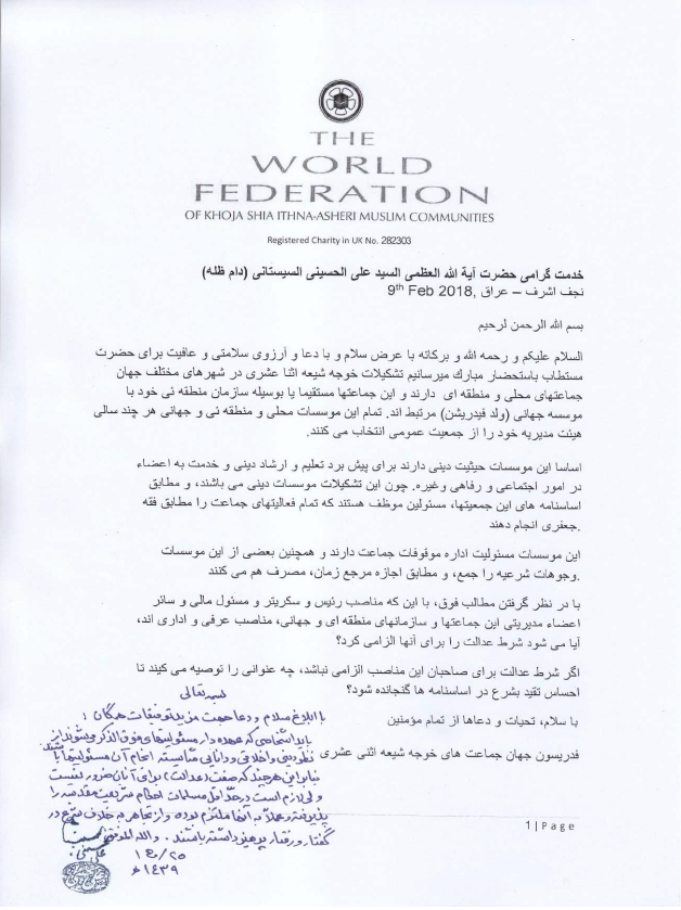 We would respectfully like to inform you that the Khoja Shia Ithna-Asheri organisations have local and regional communities in different cities around the world. These communities are associated – either directly or through their regional federations – to a global organisation called ‘The World Federation’. Every few years, all these local, regional, and global institutions elect their office-bearers through the general public [of