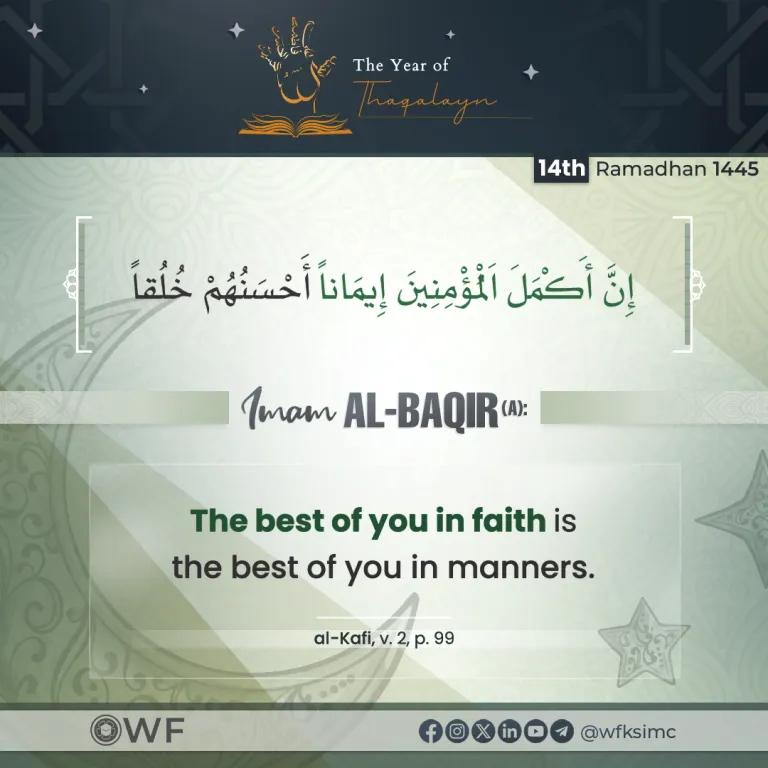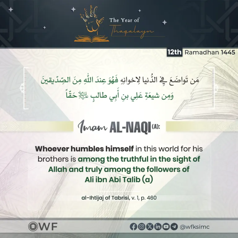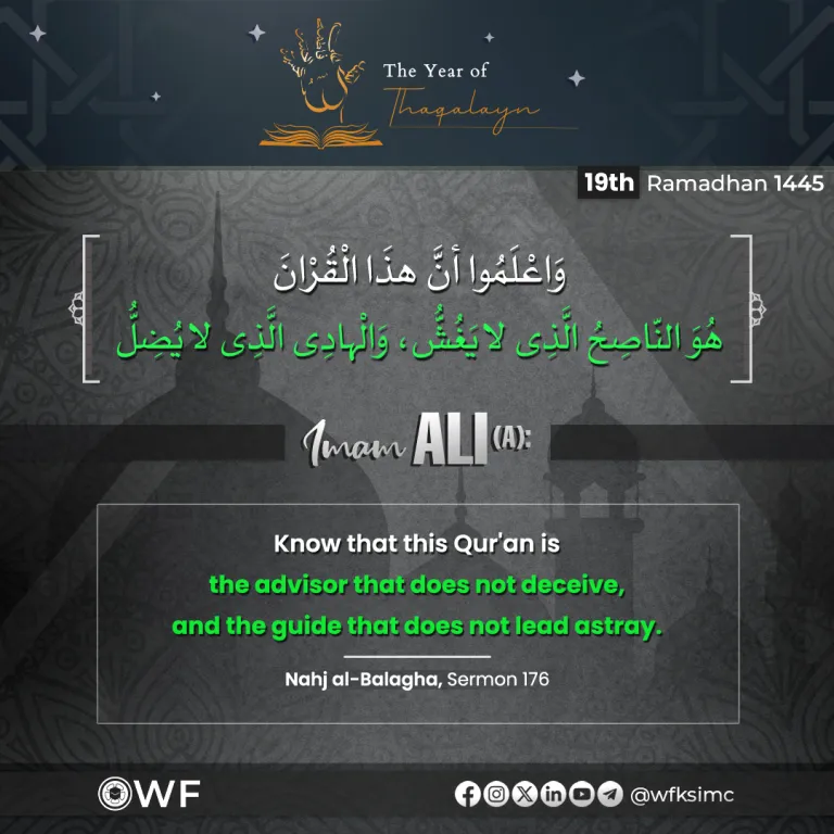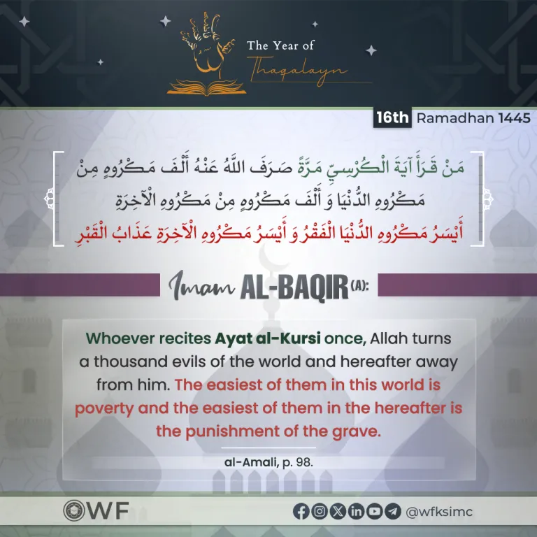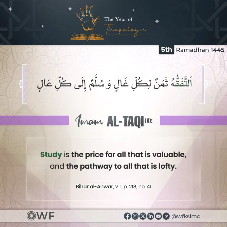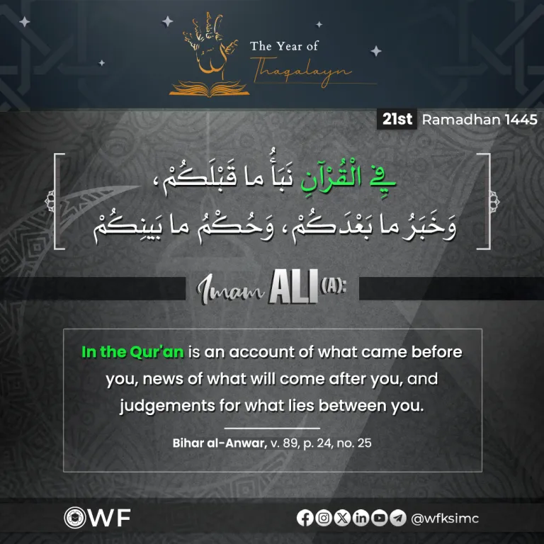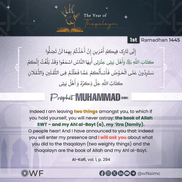 Join us each day as we embark on this spiritual journey through the Quran and Hadith of the Ahl al-Bayt (a). May these daily treaures inspire and uplift us, guiding us towards greater piety, compassion, and righteousness. Let us make the most of this sacred month and embrace the spirit of the Year of Thaqalayn.