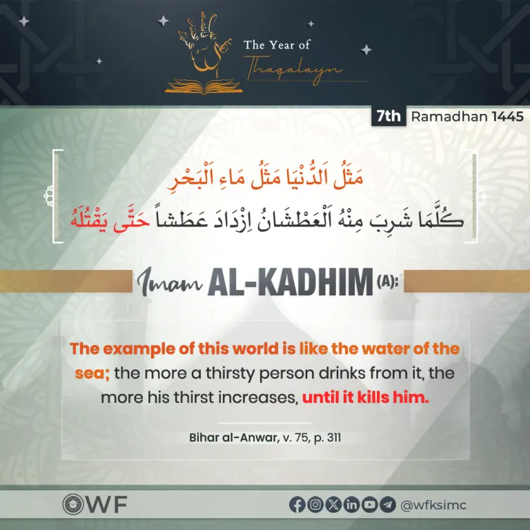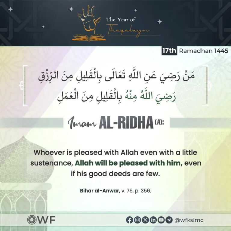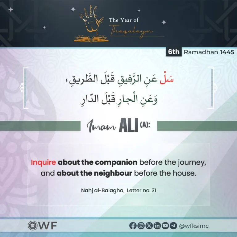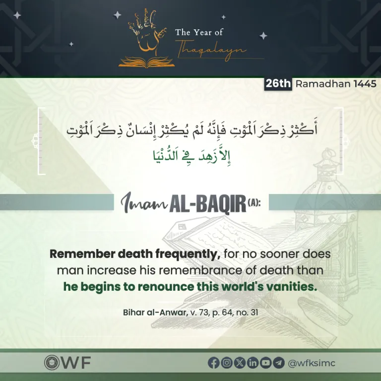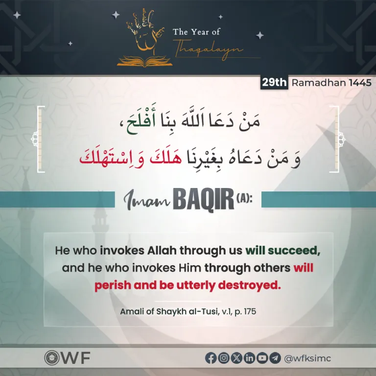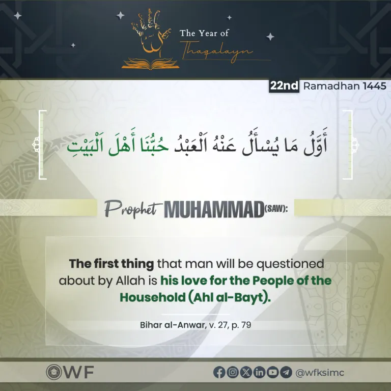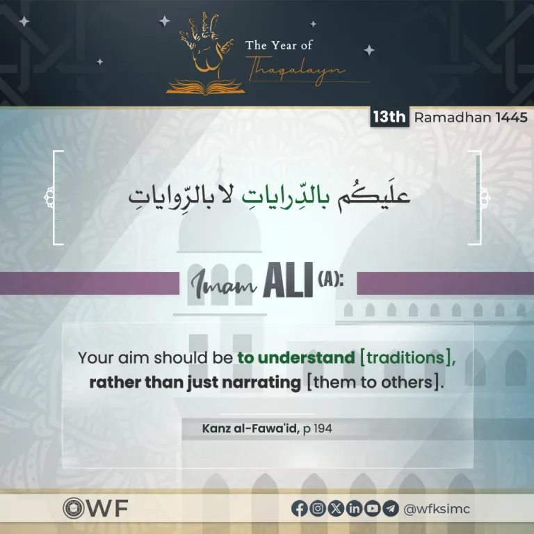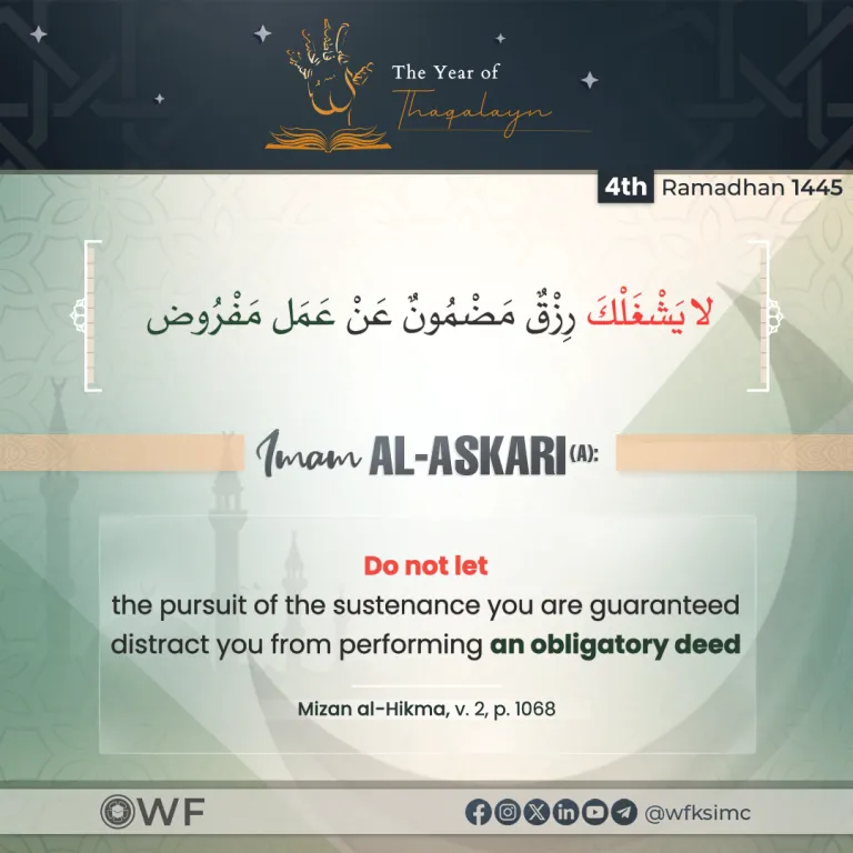 Join us each day as we embark on this spiritual journey through the Quran and Hadith of the Ahl al-Bayt (a). May these daily treaures inspire and uplift us, guiding us towards greater piety, compassion, and righteousness. Let us make the most of this sacred month and embrace the spirit of the Year of Thaqalayn.
