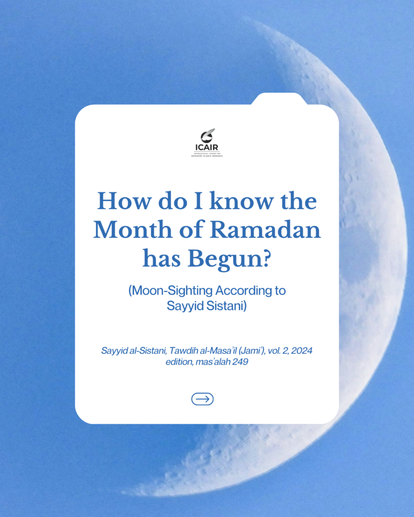 Alongside this publication, ICAIR has also released an educational Instagram carousel summarising the four recognised methods for establishing the beginning of a lunar month, based on Sayyid al-Sīstānī’s Tawḍīḥ al-Masāʾil Jāmiʿ. These include naked-eye sighting, widespread reports that produce certainty, valid testimony, and the completion of thirty days of the previous month. View the carousel on ICAIR’s Instagram page.
